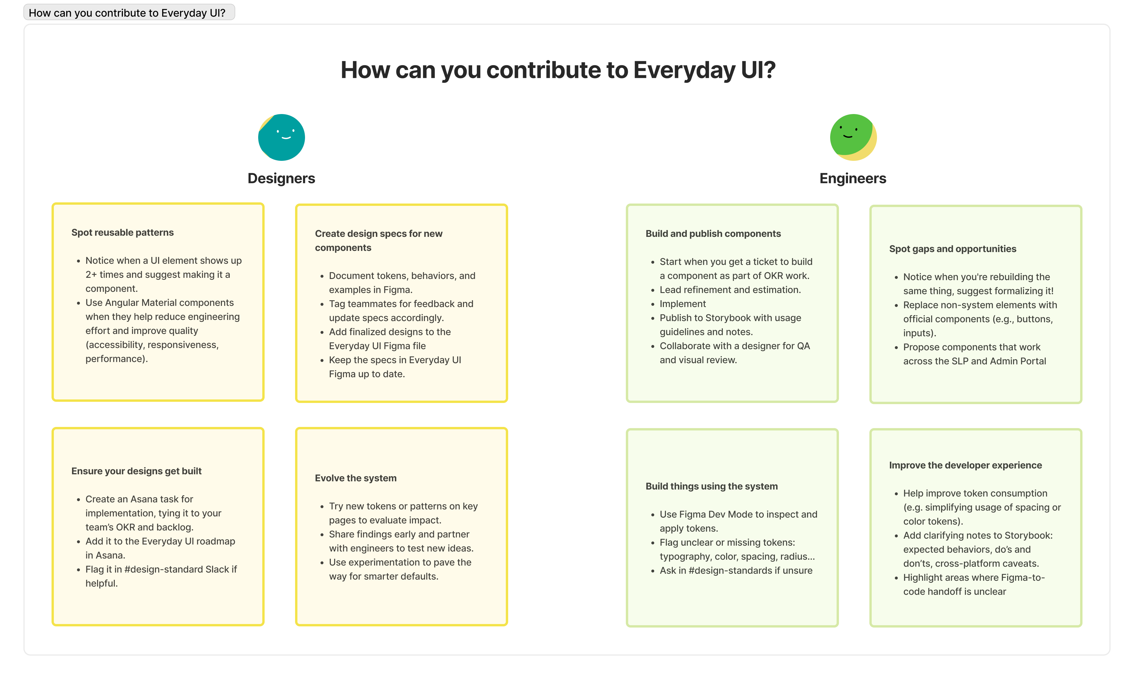 - Integrated the design system roadmap into Asana and established recurring rituals to ensure steady integration of impactful design system tasks into OKR work.