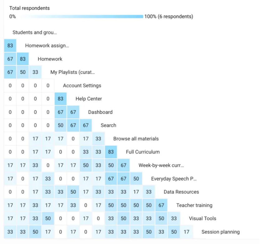 Similarity matrix: Elements from the website's architecture that were most often paired together by card sorting participants appear with a higher opacity.